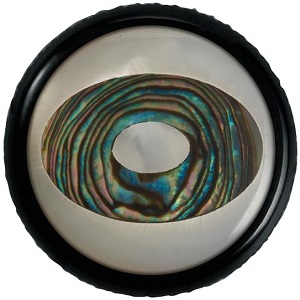 Très joli bouton travaillé avec sommet en perle de nacre abalone. Très belle définition du motif.