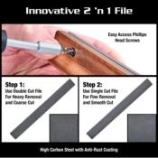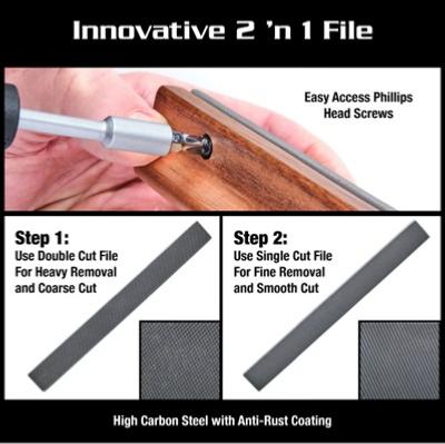 Notre lime de 6 pouces (15 cm) a un design 2 en 1, où un côté est à double coupe pour une élimination importante et une coupe grossière, tandis que l'autre côté de la lime est à simple coupe pour une élimination fine et une coupe lisse.