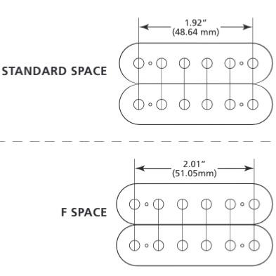 Un micro Humbucking classique comme le fameux PAF GIBSON mesure 49,2mm en position manche (mesure entre les deux trous des notes Mi grave et Mi aigu à l'entraxe, c'est-à-dire au milieu des trous) et 50mm pour la position chevalet.