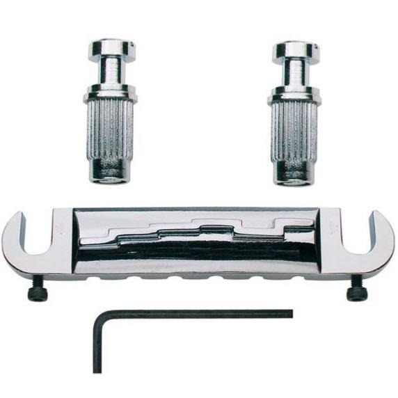 Ici, vous avez un cordier qui se fixe sur deux pivots (rivets ou studs en anglais). Et ces deux pivots se vissent dans deux inserts qui sont enfoncés dans la table de votre guitare.