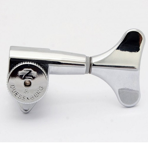 Les mécaniques de basse Duesenberg ont un système spécifique quant à la pose des cordes. On fait entrer la corde par le trou du milieu de la mécanique (là où normalement s'enroulent les cordes). On la fait dépasser jusqu'à l'arrière (le point noir que vous voyez sur la photo) et on coupe la longueur de la corde qui dépasse. On tourne la molette pour verrouiller le tout. C'est tout ! Pas besoin de perdre du temps à vouloir enrouler la corde autour de l'axe.