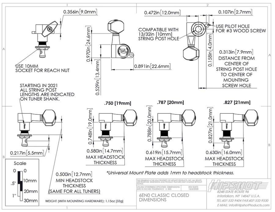 Mécaniques de marque Hipshot pour remplacement direct sur une guitare ayant 3 mécaniques de chaque côté.