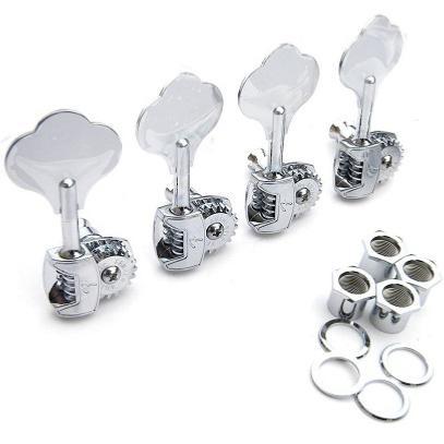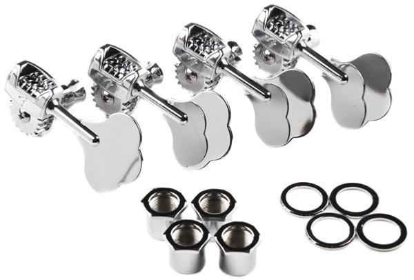 Lot de quatre mécaniques chromées, avec logo "F" de Fender estampé, compatibles avec les basses modernes Precision Bass®, Jazz Bass® et Dimension™, y compris les modèles American Standard produits à partir de 2007 et les basses American Deluxe produites à partir de 2009. Bagues et accessoires de montage inclus.