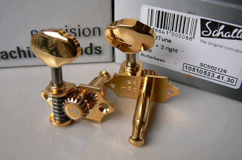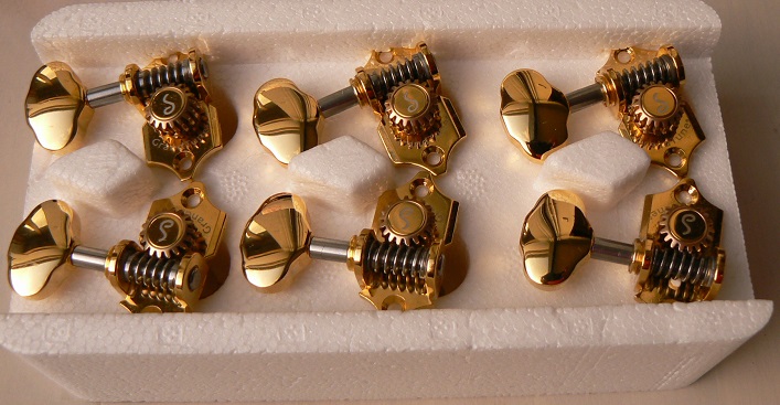 Mécaniques de marque Schaller modèle type WAVERLY haut de gamme. Le ratio de 18:1 (18 crans sur la roue qui fait tourner l'axe) permet un accordage très précis et en douceur. Les nouveaux matériaux utilisés rendent depuis des années obsolètes les mécaniques à bain d'huile. Les revêtements notamment à base de téflon rendent les engrenages auto-lubrifiants et donc sans aucun souci d'entretien. Engrenage apparent.