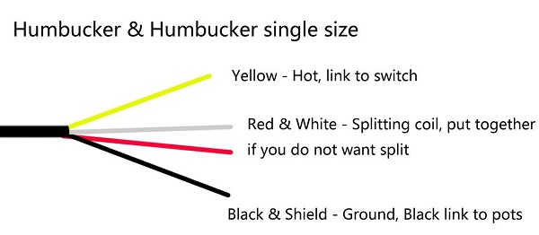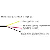 4 conducteurs : jaune (point chaud) ; rouge et blanc (pour split. Si vous ne désirez pas splitter le micro, soudez ces deux fils ensemble), noir pour potentiomètre et masse pour le fil alu.