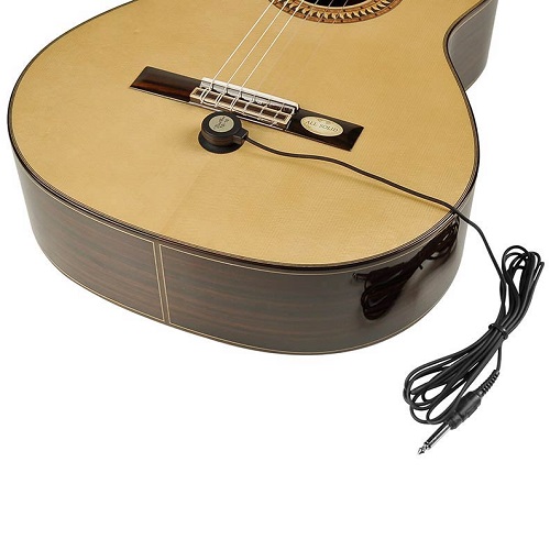 Tout comme le piezo, le Transduceur amplifie les vibrations qu'il reçoit. Le piezo se présente sous la forme d'une barrette, le transduceur sous la forme d'une pastille.Le résultat est plus naturel pour les transduceurs que les piezo.