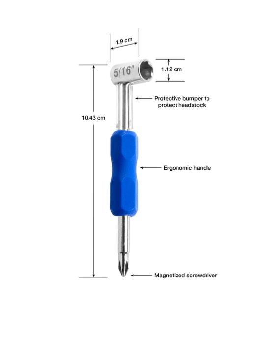 Description : Le bon outil au bon moment pour vos réglages est ce qu'il y a de plus important. La clé de Truss Rod Music Nomad est fabriquée en acier de carbone et sa poignée ergonomique rend toutes les tâches simples et confortables. Nous avons même pensé à magnétisé le tournevis pour les petites vis des caches.