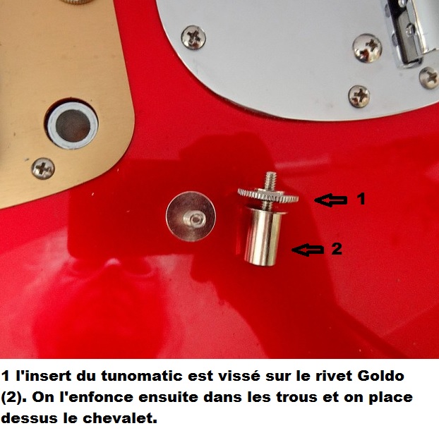 L'idée est d'enfoncer les inserts et de visser dessus un chevalet Tunomatic (avec comme contrainte de mettre un Tunomatic métrique avec petits rivets de 4mm de diamètre interne et 4.5mm de diamètre externe).
