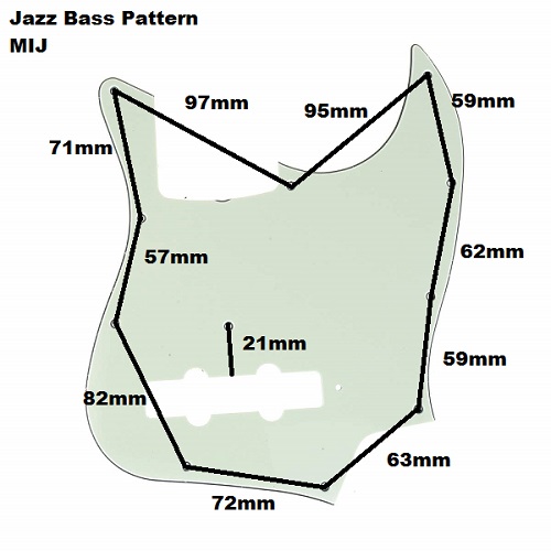 Quasiment la réplique des pickguard utilisés par Fender sur les modèles de 1962 sans les trous pour le repose-pouce. Vis autour du micro pour le cache, vis du pickguard à gauche du micro décalée au dessus pour laisser la place au cache-micro. Et la vis au-dessus du micro pour mieux fixer le pickguard et éviter le gondolement. Pour finir, la petite découpe au niveau de la jonction Corps/Manche.