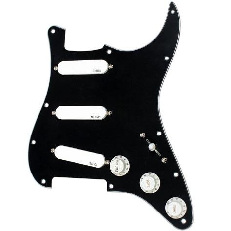 Pickguard pré-assemblé avec set de trois micros de marque EMG qu'il n'y a plus qu'à installer en clipsant la prise jack !