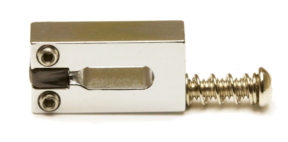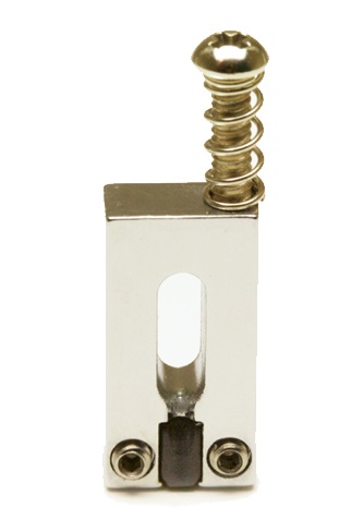 Les vis sont excentrées contrairement aux pontets des guitares dites Vintage (chevalet fixé à l'aide de 6 vis).