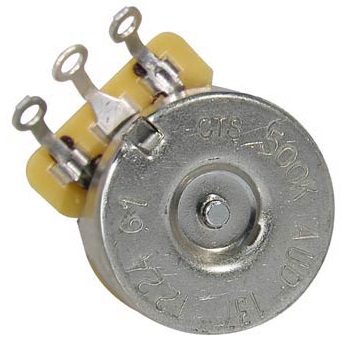 Potentiomètre CTS audio 500K split shaft (axe cannelé). Spécialement étudié pour se visser sur les plaques en plastique comme sur les Stratocaster ou guitares assimilées (Ibanez par exemple). La tige en laiton fait 15mm.