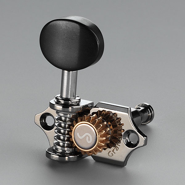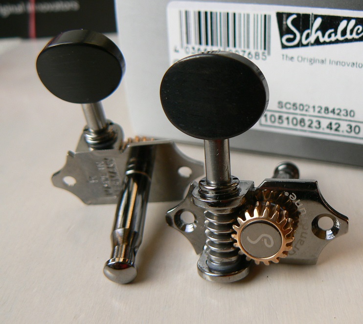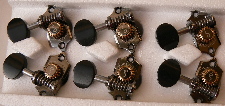 Mécaniques de marque Schaller modèle type WAVERLY haut de gamme. Le ratio de 18:1 (18 crans sur la roue qui fait tourner l'axe) permet un accordage très précis et en douceur. Les nouveaux matériaux utilisés rendent depuis des années obsolètes les mécaniques à bain d'huile. Les revêtements notamment à base de téflon rendent les engrenages auto-lubrifiants et donc sans aucun souci d'entretien. Engrenage apparent.