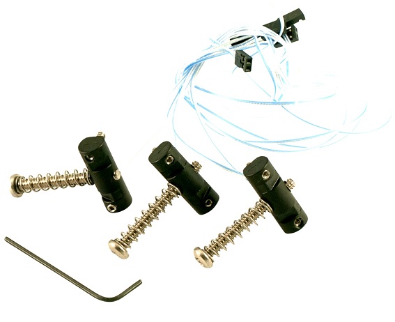 Pontets en polymère. Matériau auto lubrifiant (5 fois supérieur au graphite). A chaque mouvement de la corde, un mince filet de Téflon (le lubrifiant interne le plus efficace) est créé. Le son est plein et plus brillant avec plus de sustain que le cuivre ou le métal.