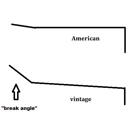 La plus basse des tiges de vibrato Fender (35mm de haut à partir du filetage au lieu de 38mm sur les Vintage American 0992039000). Elle possède une poignée plus anguleuse que la version Vintage Fender (ce que Fender appelle le "break angle"). Nous avons essayé de faire un schéma pour montrer les différences.