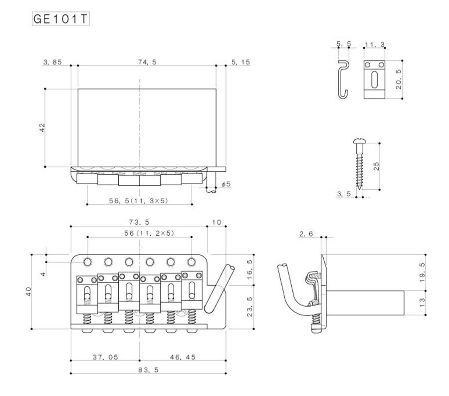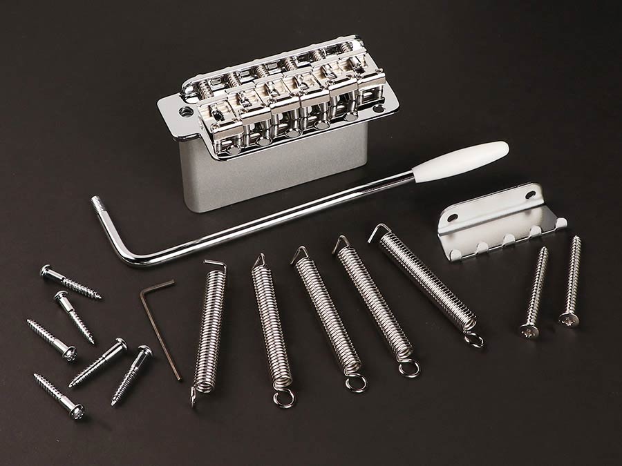 Le bloc vibrato est complet, livré avec le nécessaire de fixation (vis + tige) ainsi qu'une clé allen pour régler la hauteur des pontets. Livré en sachet luthier. Gotoh ne propose pas d'emballage pour ses chevalets type Strat.